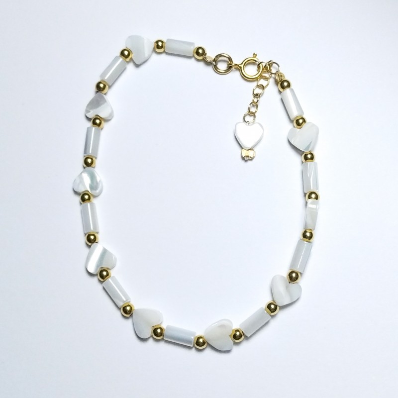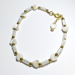 PULSEIRA COM CORAÇÃO MADRE PEROLA, TUBO E BOLA EM PRATA DOURADA